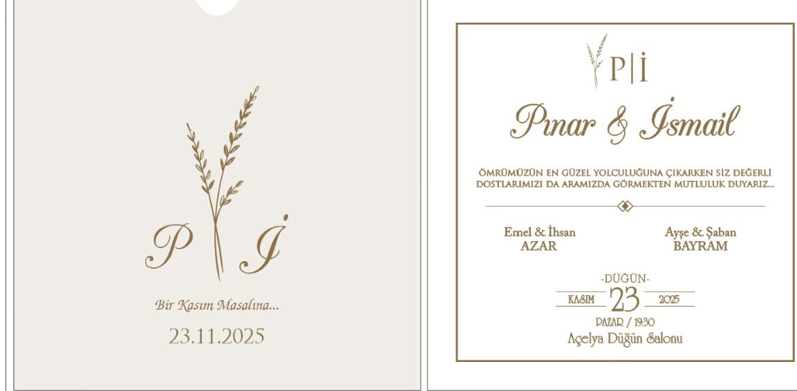 Emel ve İhsan AZAR çiftinin kızları Pınar ile Ayşe ve Şaban BAYRAM çiftinin oğulları İsmail‘in 23.11.2025 tarihinde düğünleri vardır. Bu mutlu günlerinde siz dost ve akrabaları aralarında görmekten mutluluk duyacaklardır. Kendilerini tebrik eder, bir ömür boyu mutluluklar dileriz.
